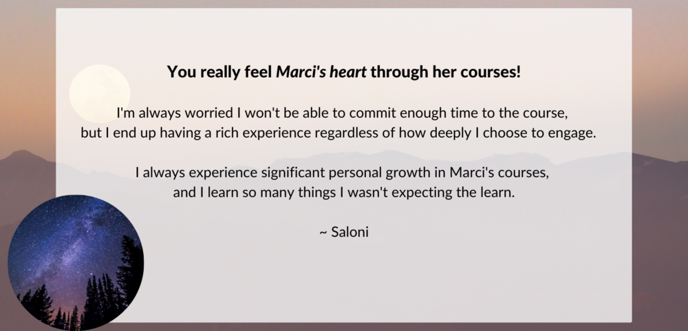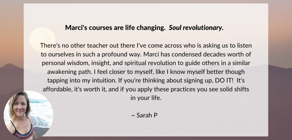 “I am so grateful for this course and for Marci leading us through something so rich, empowering, and authentic. Marci’s authenticity, experience, and spirit provided me the space to trust and dive into intuition work. Her wealth of knowledge, encouragement, guidance, care and support made the materials digestible and fun.”